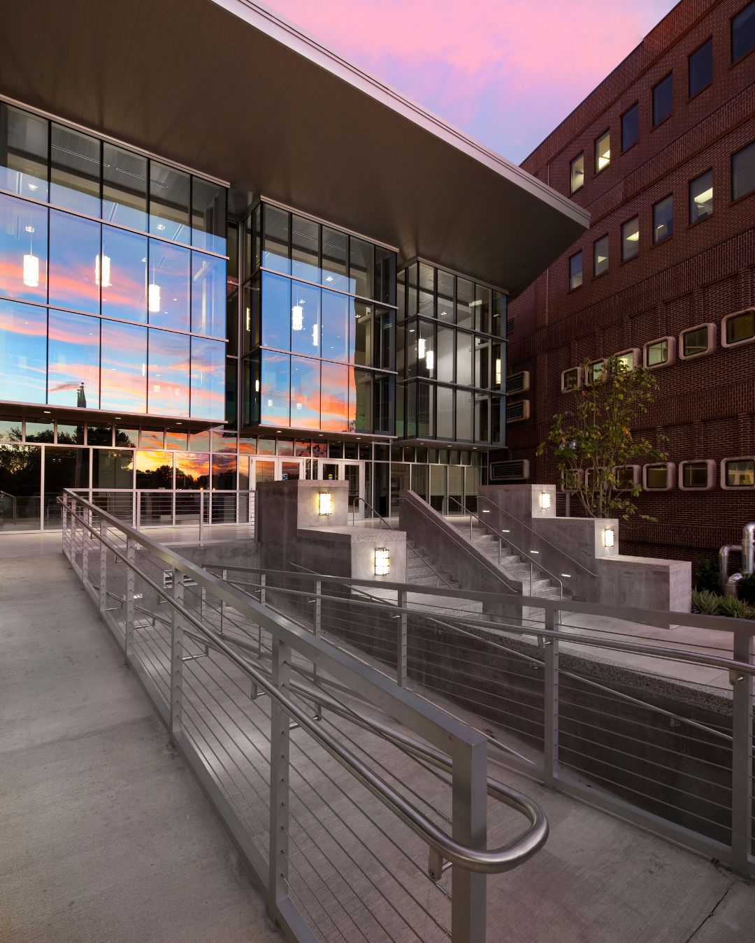 The use of transparent glass “tubes” bridges the distinct architectural styles of the adjacent buildings, creating a cohesive visual and spatial connection. This light-filled, modern addition not only improves daily operations but also establishes a refreshed identity for the Louisiana Workforce Commission—one that reflects openness, connectivity, and forward-thinking design.